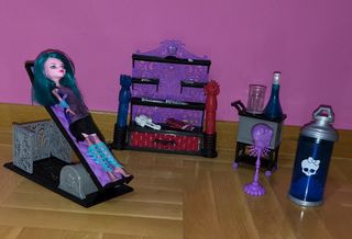 Muñeca Monster High de River Styxx, con su característico estilo. *Precio negociable* - Incluye capa negra con capucha - Accesorios como bastón y peine. - Base para exhibición.