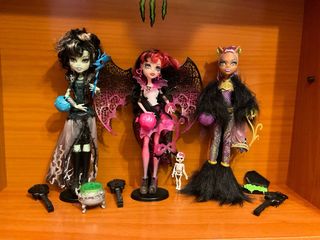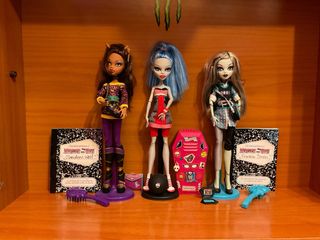 Lote de tres muñecas Monster High. *Precio negociable* - Muñeca Clawdeen Wolf. - Muñeca Frankie Stein. - Muñeca Ghoulia Yelps - Accesorios incluidos de Ghoulia: pelota, taquilla, libro, peine, gafas, botella, libro, chándal y candado