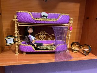 Litera de Monster High, modelo de Clawdeen Wolf. Incluye accesorios. *Precio negociable* - Cojín de calavera. - Armario con: candelabro, cuchilla, planchas de pelo, maquillaje y lata. - Peine - Mantas de leopardo - Espejo - No incluye palo para sujetar a la muñeca