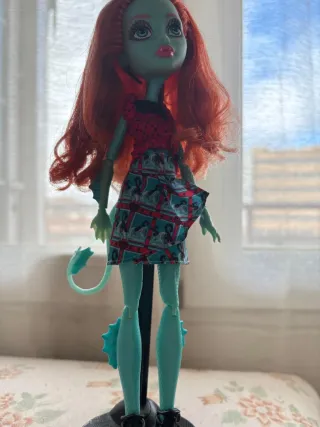 Muñeca de la colección Monster High, personaje Lagoona Blue. - Pelo largo de color naranja. - Vestido con estampado. - Incluye soporte para la muñeca.