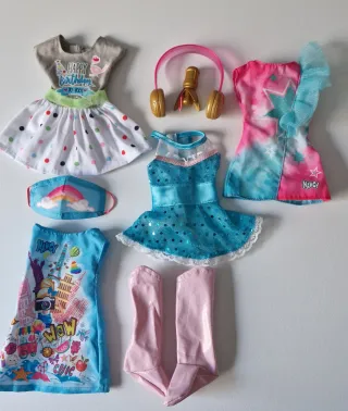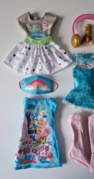 Conjunto de ropa y accesorios para muñeca Nancy. - Vestido gris con estampado Happy Birthday y falda de lunares. - Vestido azul brillante con detalles de encaje. - Vestido azul con estampado de ciudades y WOW. - Vestido rosa y turquesa con estrellas y volantes. - Mascarilla con diseño de arcoíris. - Auriculares rosas con micrófono dorado. - Botas altas rosas. - Muy buen estado Hago envíos por wallapop