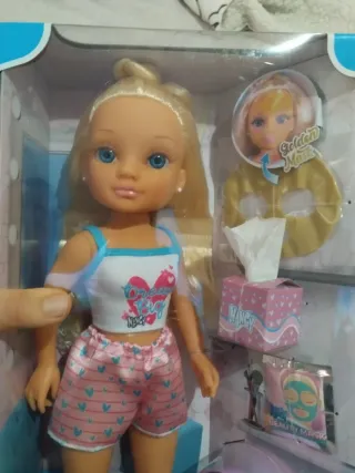 Muñeca Nancy con temática de spa y cuidados faciales. Incluye accesorios para recrear una rutina de belleza. - Muñeca Nancy con pijama y accesorios. - Set de spa con mascarilla facial. - Incluye varios accesorios pequeños para el juego.