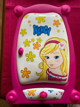 Se vende muñeca Nancy con su maleta-tocador. - Muñeca con vestido rosa y zapatos brillantes. - Maleta desplegable con espejo y luces. - Compartimentos para accesorios de belleza. - Incluye maletín pequeño.
