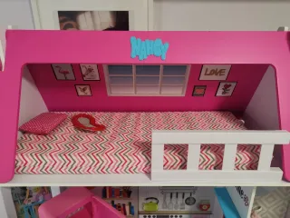 Casa de muñecas Nancy con varios accesorios para jugar -Incluye: - Cocina equipada con horno y accesorios. - Baño con lavabo rosa y accesorios de baño - Cama con ropa de cama - Exterior con tumbona azul y buzón. - Vallas decorativas. -16 prendas de ropa + 3 pares de zapatos + accesorios, ropa interior, etc... -muñeca Nancy peliroja