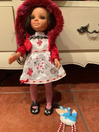 Muñeca Nancy modelo Caperucita Roja en buen estado. - Vestido blanco con estampado de lobos y corazones. - Chaqueta roja con capucha. - Medias a rayas rojas y blancas. - Zapatos negros con detalles de orejas.