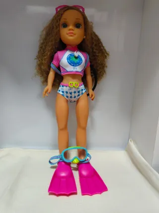 Muñeca Nancy vestida de buzo, lista para explorar el océano. Incluye accesorios para la aventura. - Traje de baño con estampado. - Gafas de buceo. - Aletas de color rosa.