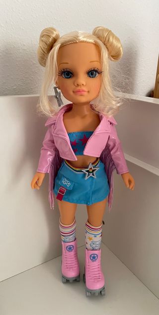 Muñeca Nancy con patines. - Chaqueta rosa con flecos. - Top azul con estrellas. - Falda vaquera azul. - Cinturón con estrella. - Calcetines a rayas. - Patines rosas.