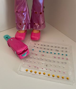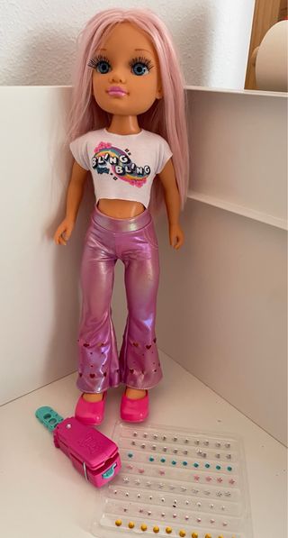 Muñeca Nancy Un Día de Look Brillante con accesorios. - Incluye muñeca con conjunto. - Set de pegatinas brillantes y aplicador.