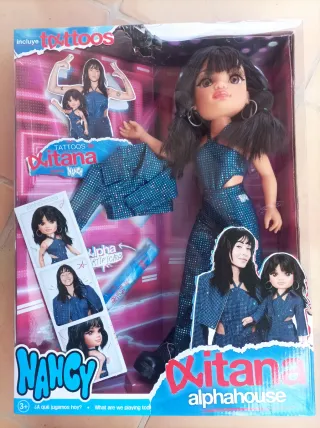 Muñeca Nancy de la colección Aitana, inspirada en la artista. - Incluye tatuajes. - Viene con un conjunto de moda brillante. - La caja muestra imágenes de Aitana y la muñeca.
