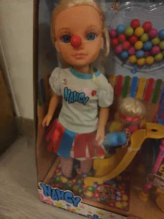 Nancy completa. Solo puesta en vitrina. Como nueva. La caja algo deteriorada. Descatalogada. Ideal coleccionistas. - Incluye accesorios. - Presentada en su caja original. Muñeca Nancy con su parque de bolas y accesorios. - Incluye muñeca Nancy. - Parque de bolas con tobogán. - Accesorios temáticos de payaso y juego.