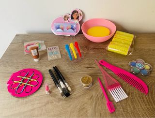 Set de accesorios para muñeca Nancy. Incluye varios artículos para jugar y crear looks. - Set de brochas de maquillaje. - Peine y cepillo para el pelo. - Rizadores de pelo. - Paleta de sombras de ojos. - Pegatinas. - Gomas para el pelo. - Lote de accesorios de peluquería.