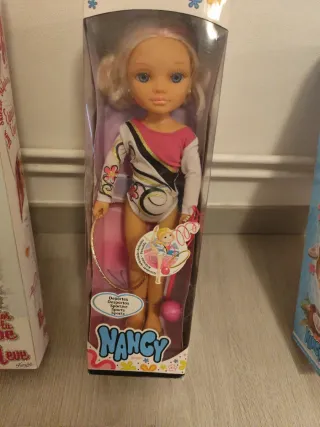 Nancy completa. Solo puesta en vitrina. Como nueva. La caja algo deteriorada. Descatalogada. Ideal coleccionistas. Muñeca Nancy vestida para gimnasia rítmica, lista para la competición. - Incluye aro y pelota. - Traje de gimnasia con detalles. - Pelo rubio y ojos azules.