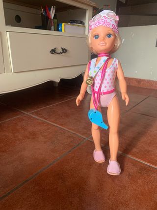 Muñeca Nancy vestida para la competición de natación. Viene con accesorios para completar su look de deportista. - Traje de baño rosa con estampado floral. - Gorro de natación a juego. - Medalla de competición. - Silbato azul.