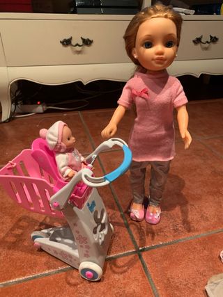 Muñeca Nancy con su coche. - Coche de color beige con detalles en azul y rosa. - Incluye muñeca Nancy con ropa. - Ruedas blancas con borde rosa.