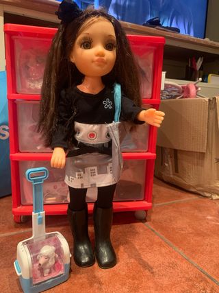 Muñeca Nancy lista para viajar con su adorable perrito y su maleta. - Incluye muñeca Nancy. - Perrito blanco. - Transportín de mascotas con ruedas y asa. - Vestimenta de la muñeca: vestido, medias y botas.