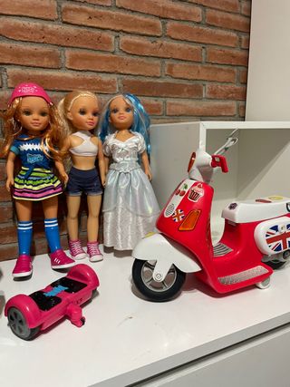 Lote de tres muñecas Nancy con accesorios. - Muñeca Nancy con vestido azul y rosa, gorra rosa. - Muñeca Nancy con top blanco y shorts vaqueros. - Muñeca Nancy con vestido plateado y pelo azul. - Incluye patinete eléctrico rosa y moto roja.