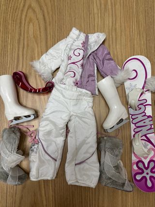 Conjunto de ropa y accesorios para muñeca Nancy. - Traje de esquí blanco y lila con detalles. - Botas de patinaje blancas. - Botas de pelo grises. - Tabla de snowboard.