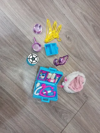 Lote de accesorios variados para muñecas. - Maletín médico azul con accesorios. - ganchos para armario nancy amarillas. - Dos recipientes metálicos (plastico). - lucero nieve - cofre. - pendientes - cocina - Un goro nieve osa con borde blanco.