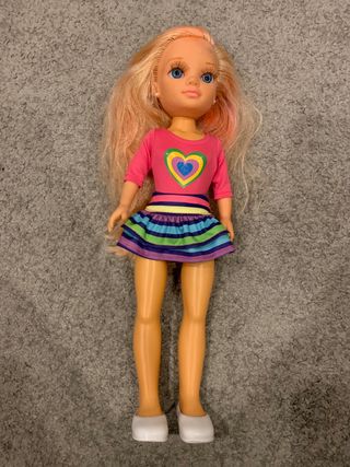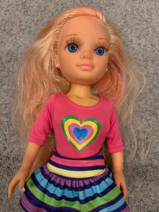 Muñeca Nancy con pelo rubio y ojos azules. Viste una camiseta rosa con un corazón multicolor y una falda a rayas. - Camiseta rosa con diseño de corazón. - Falda a rayas de colores. - Zapatos blancos.