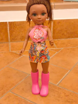Muñeca Nancy mulata con un conjunto veraniego. Algo menos morena que Anabella. - Top rosa con estampado. - Falda corta con estampado. - Botas altas rosas.