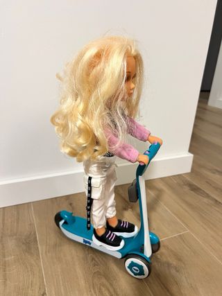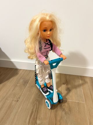 Muñeca Nancy con su patinete. - Patinete de color azul y blanco. - Muñeca con pelo rubio. - Incluye mochila negra.