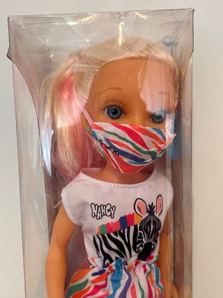 Muñeca Nancy mascarilla Arcoiris. Famosa Totalmente nueva, precintada y en su embalaje original. Nancy lleva una bonita mascarilla a juego con su vestido de estampado de cebra multicolor. Además, su pelo es rubio con mechas rosas, al igual que sus zapatos. Para más información no dudes en consultar. Entrega en mano o envío protegido