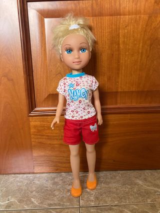 Muñeca Nancy con pelo rubio y ojos azules. - Camiseta blanca con estampado floral y el nombre Nancy. - Pantalón corto rojo. - Zapatos planos naranjas.