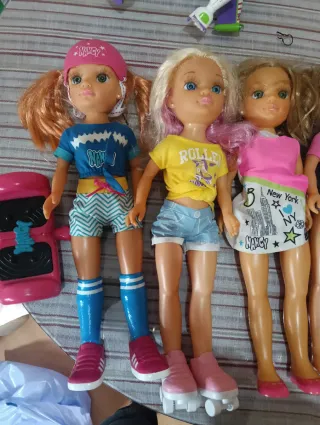 Lote de tres muñecas Nancy. - Muñeca con vestido rosa y falda de volantes arcoíris. - Muñeca con camiseta gris y falda de lunares. - Muñeca con vestido rosa y falda plisada. - Están en buen estado solo que el pelo de dos muñecas están cortados y una muñeca esta un poco pintada en la cara. - Precio negociable.