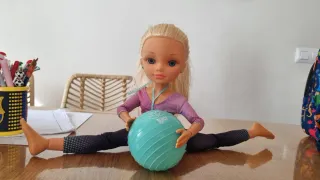 Muñeca Nancy con temática de yoga, lista para practicar posturas. - Incluye una pelota de ejercicio. - Ropa deportiva (le faltan los calcetines). - Piernas articuladas para diferentes poses.
