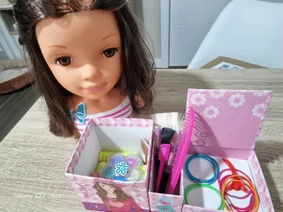 Set de peinado y maquillaje de Nancy. - Incluye accesorios para el cabello. - Contiene un neceser decorado con flores y una muñeca. - Incluye varias gomas y horquillas.