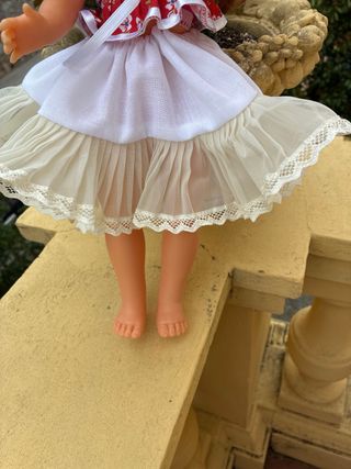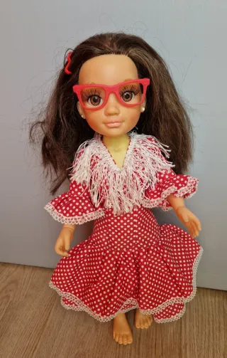 Muñeca Nancy vestida de flamenca con un bonito traje rojo de lunares blancos. Incluye gafas rojas. - Vestido rojo con lunares blancos. - Adorno blanco en el cuello. - Gafas rojas. La muñeca tiene la parte superior del torso descolorido (amarillento) Las fotos forman parte de la descripción Hago envíos por wallapop