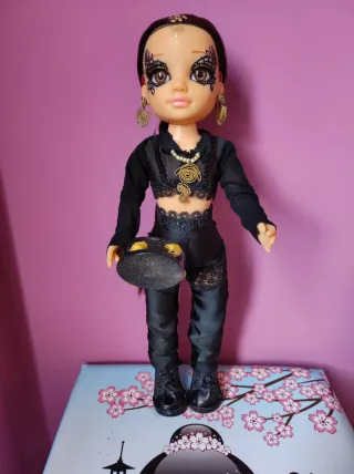 Muñeca Nancy personalizada con un estilo único inspirado en Tanxugueira. Lista para coleccionar o jugar - Accesorios dorados: pendientes, collar y adorno en la cabeza. - Zapatos negros. - Maquillaje detallado en ojos y frente.