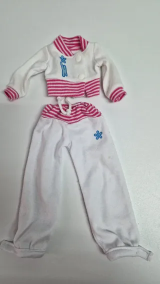 Conjunto de ropa para muñeca Nancy. - Incluye un body a rayas rosas, blancas y azules. - Pantalón largo rosa. - Un muñequera a juego con el body.