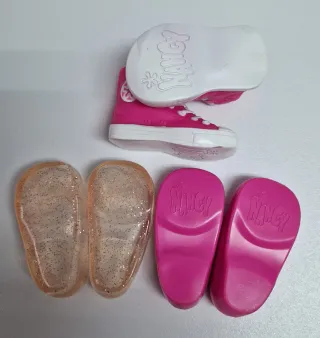 Conjunto de zapatos para muñeca Nancy. - 1 par de zapatillas deportivas rosas con efecto cordones blancos. - 1 par de zapatos planos transparentes con purpurina. - 1 par de zapatos planos rosas fucsia. A 4€ cada par 10€ todos Hago envíos por wallapop
