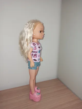 Muñeca Nancy con camiseta rosa y pantalones cortos vaqueros. - Camiseta con estampado. - Pantalones cortos de tela vaquera. - Zapatos rosas. - Pelo rubio largo.