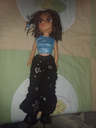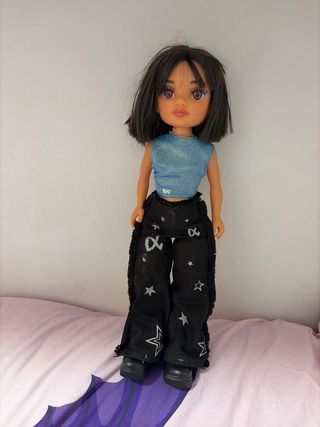 Muñeca Nancy Aitana. - Pelo negro. - Top brillante azul. - Pantalones negros con tiras.