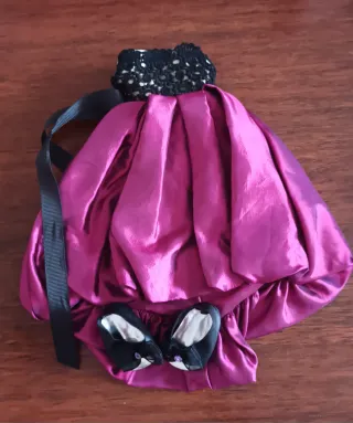 Conjunto de vestido y zapatos para muñeca Nancy. - Vestido de tela satinada color fucsia. - Cuerpo del vestido con detalles de encaje negro. - Incluye lazo negro. - Zapatos negros a juego con detalle morado.