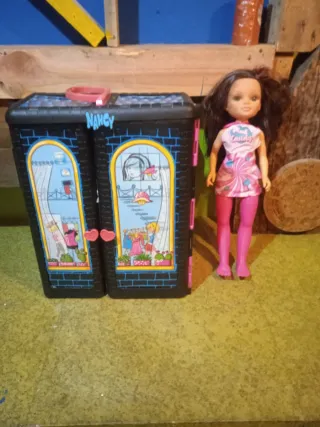 Set de muñeca Nancy con su armario. - Armario negro con detalles de ladrillo y puertas. - Incluye dos puertas con ilustraciones de moda. - Muñeca Nancy con vestido rosa y mallas. - Asa rosa en la parte superior del armario.