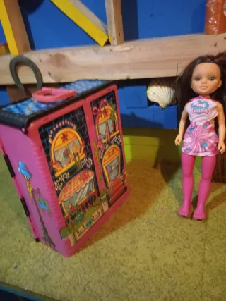 Conjunto de ropa y accesorios para muñeca Nancy: - Vestido rosa de lunares negros con lazo. - Vestido azul y blanco a rayas con bolsillos. - Bañador morado de lunares blancos. - Zapatos transparentes brillantes. - Maleta negra con ruedas y asa. - Secador de pelo rosa. - Plancha de pelo azul y rosa. - Cepillo y peine rojos. - Un libro azul. - Un paquete rosa. - Tijeras