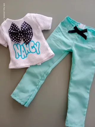 Conjunto de ropa para muñeca Nancy. - Camiseta blanca con estampado Nancy y lazo negro. - Pantalón verde menta con lazo negro.