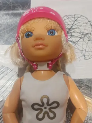 Muñeca Nancy vestida de patinadora con patines, lista para la acción. - Incluye casco rosa con detalles florales. - Ropa de patinaje con falda a juego. - Patines blancos con detalles dorados y rosas. - Accesorios adicionales como rodilleras y el mando en forma de flor (hace falta cambiar las pilas, lleva 3 LR44). Rebajada, urge venta por falta de espacio