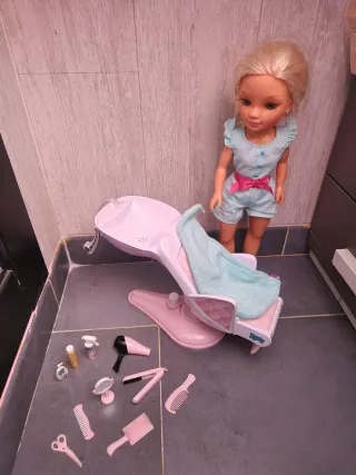 Muñeca Nancy con accesorios para un día en la peluquería. Incluye varios complementos para jugar. - Lavacabezas. - Secador de pelo. - Plancha. - Cepillos y peines. - Espejo. - Botellas de champú y spray. - Toalla.