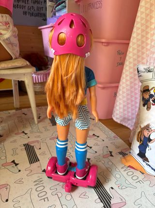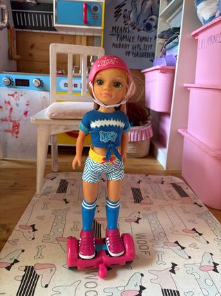 Muñeca Nancy con su hoverboard. Incluye: - Muñeca Nancy. - Hoverboard rosa. - Casco rosa. Pilas no incluidas.