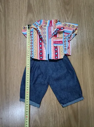 Conjunto de ropa para muñeca de 38–42 cm. Incluye camisa estampada y pantalón tipo denim. Pieza nueva sin etiquetas, con buena confección y acabados cuidados. Compatible con muñecas como Nancy, Paola Reina 42 cm, Our Generation 18” y modelos similares. Procede de la zona juguetera de Onil (Alicante), conocida por su tradición en ropa de muñeca. Medidas en plano: parte de arriba 16×18 cm, parte de abajo 22 cm. Ideal para completar el vestuario de muñecas de este tamaño.