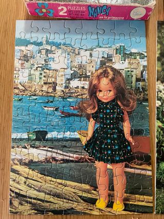 Lote de dos puzzles de la muñeca Nancy de Famosa. Uno de ellos es de 80 piezas y el otro también. - Puzzle 1: Muñeca Nancy en un jardín con flores. - Puzzle 2: Muñeca Nancy en un puerto con casas al fondo. Completos , tal cual fotos .