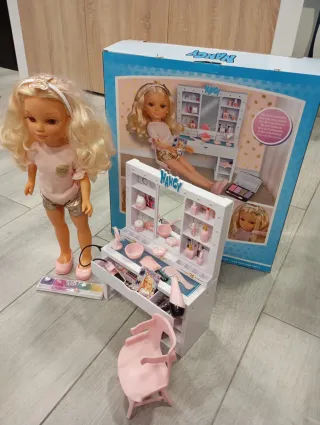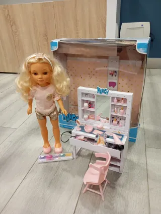 Set de tocador y muñeca Nancy para jugar. Poco uso, completo - Incluye tocador con accesorios. - Muñeca Nancy rubia con diadema. - Silla rosa. - Paleta de maquillaje.
