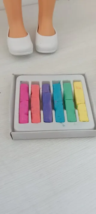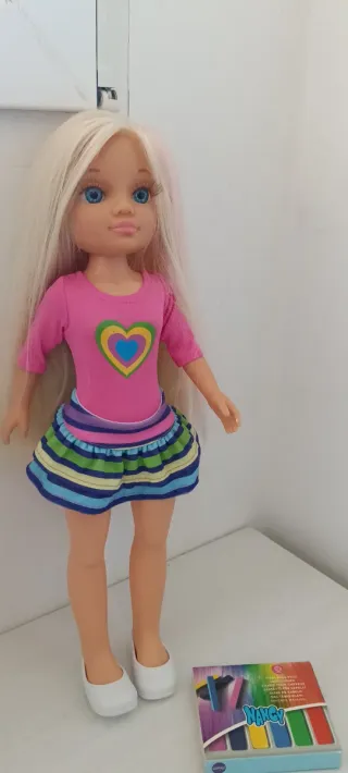 Muñeca Nancy con pelo rubio largo, ojos azules y un conjunto de moda. - Camiseta rosa con un corazón multicolor. - Falda a rayas azules, verdes y amarillas. - Zapatos blancos. - Incluye caja de pinturas de pelo Nancy. Las tizas están rotas pero prácticamente sin uso.