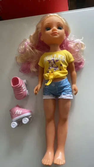 Muñeca Nancy Un día en California con accesorios. - Incluye dos patines rosas con ruedas blancas. - vaso de batido rosa - Camiseta amarilla con estampado. - Pantalones cortos vaqueros. La muñeca tiene mechas rosas. Completamente nueva. Precinto del pelo. Sin ningún uso. Se puede comprar sola o con el coche descapotable rosa (20€). Todo 35€