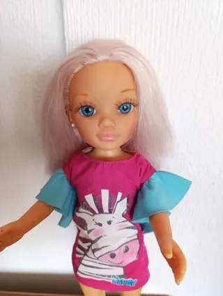 Muñeca Nancy con un divertido vestido. - Vestido rosa con estampado de cebra. - Manga corta de color azul. - Zapatos rosas. En muy buen estado, casi sin usar. Se entrega en la zona de metro Canillas. Más juguetes es mi perfil.