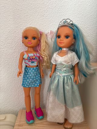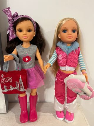 Dos muñecas Nancy con sus accesorios, listas para jugar. - Una muñeca con vestido azul brillante y botas rosas. - Otra muñeca con shorts vaqueros y chaqueta blanca de pelo. - Incluyen maletas de viaje con ruedas. -cada muñeca 15 las dos por 25